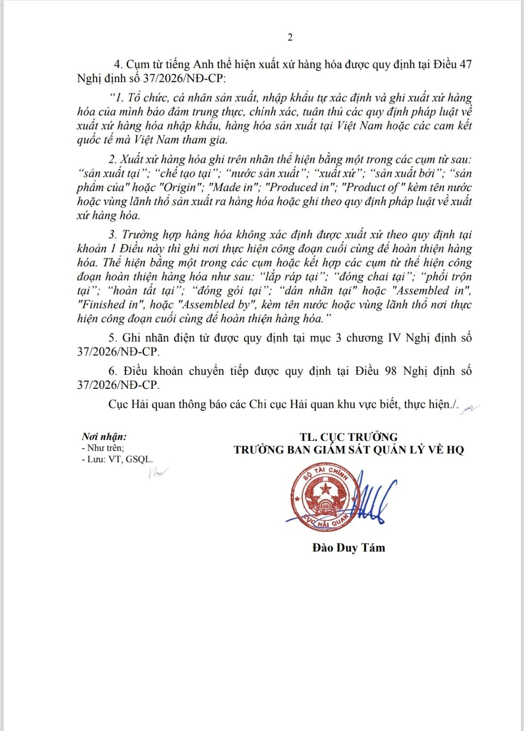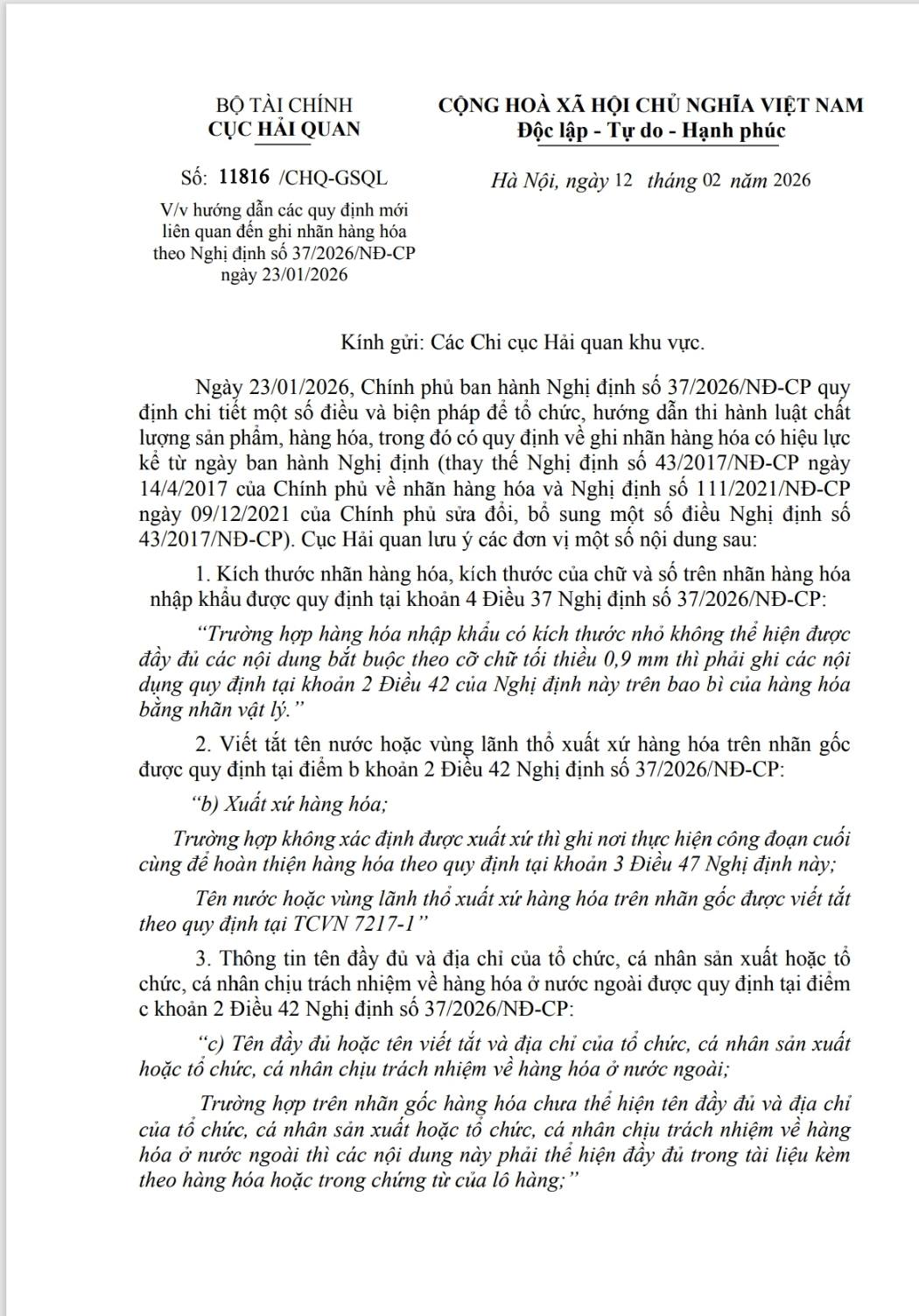 Cục Hải quan vừa ban hành Công văn 11816/CHQ-GSQL (ngày 12/02/2026) hướng dẫn triển khai các quy định mới về ghi nhãn hàng hóa theo Nghị định 37/2026/NĐ-CP (ngày 23/01/2026), đề nghị các Chi cục Hải quan khu vực thực hiện thống nhất, tránh vướng mắc, ùn tắc, đảm bảo thông quan hàng hóa nhanh chóng cho doanh nghiệp.